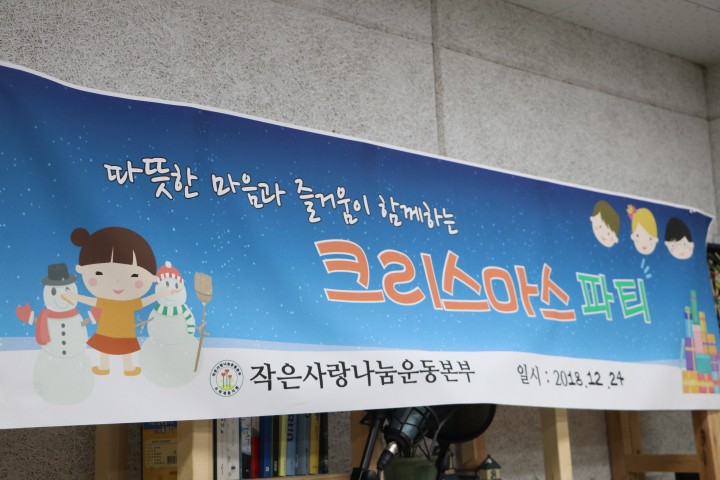 작은사랑나눔운동본부 사무실에서 연말 크리스마스 이브를 맞이하여 성탄절행사를 진행했습니다. 행사에 참여한 아이들을 위해 맛있는 자장면과 새꼬시, 그리고 피자와 음료를 주었습니다. 그리고 장기자랑을 통해서 아이들에게 선물을 주었습니다. 이 날 행사에 참여한 많은 가정에게 크리스마스케이크와 마스크팩, 핸드크림, 샴푸, 클렌징폼 등 푸짐한 선물을 전달했습니다. 행사를 위해 힘 써주시고, 참여해주신 모두들 수고 많으셨습니다. 감사합니다.