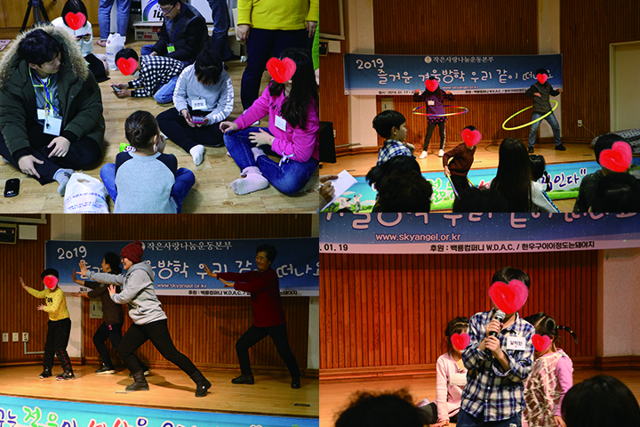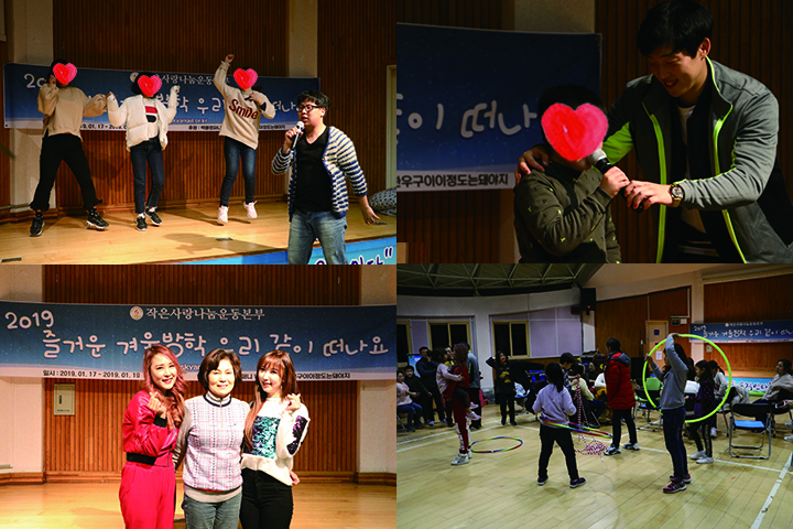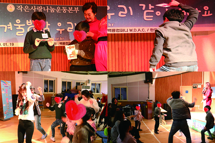 올해도 작은사랑나눔운동본부는 즐거운 마음으로 소외계층 아이들과 함께 겨울수련회를 다녀왔습니다. 1월 17일(목)~19일(토)까지 2박 3일동안 공기좋은 양평으로 떠나서 잊지못할 소중한 추억을 쌓았습니다. 즐거워 하는 아이들의 얼굴을 보며, 아직 추운 겨울이지만 마음이 따듯해지는것을 느낍니다. 자원봉사자 여러분들과 도움을 주신 모든분들께 깊은 감사의 말씀을 드립니다.