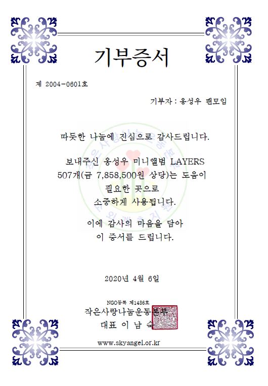 '옹성우 팬모임'에서 수제마스크 20개와 가수 옹성우 첫번째 미니앨범인 LAYERS 507개를 보내주셨습니다. 이 앨범들은 전국에 있는 지부와 복지관 등 많은 단체를 통해 소외계층 및 저소득층 가정으로 나누어서 전달 될 예정입니다. 어려운 우리의 이웃들을 위해 물품을 후원해주신 가수 옹성우님과 팬 여러분들께 다시 한번 진심으로 감사드립니다.