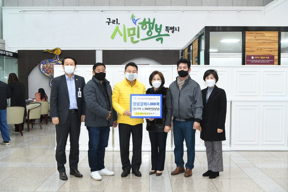 육우갈비 600g, 1000팩 19,800,000원 상당 구리시 어려운 이웃을위해 전달했습니다. (사진좌측부터 구리시복지문화국장 김영선, 본단체 이윤복부회장,구리시장 안승남, 본단체 이남숙대표, 강재원부회장,구리시주무관) 구리시장(안승남)은 코로나19로인해 어려운시기에 소외계층을 위해 좋은 나눔을 주셔서 작은사랑나눔운동본부 대표님 그리고 회원님들에게 깊은 감사말씀을전했다. |
