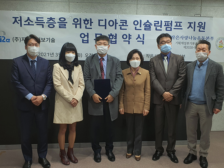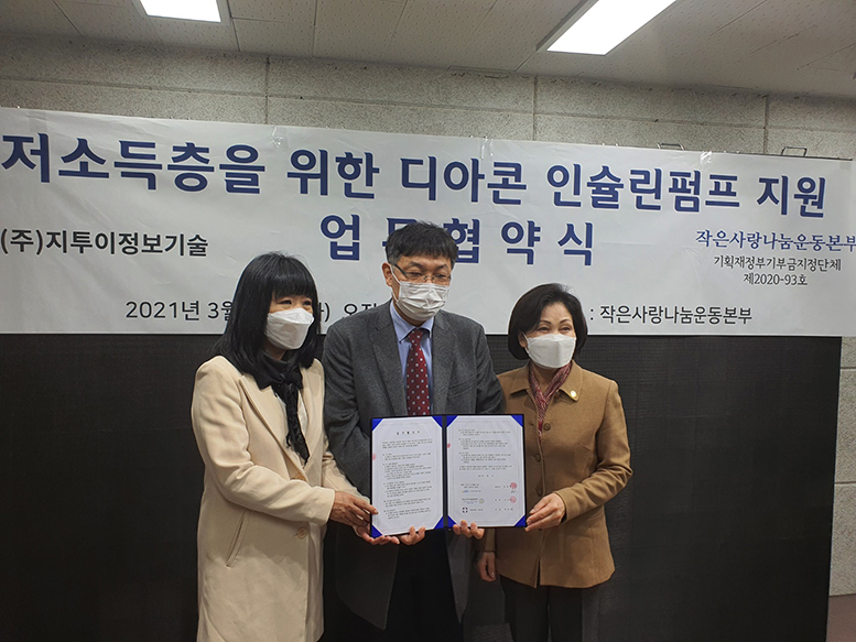 3월 23일 화요일, (주)지투이정보기술과 작은사랑나눔운동본부가 코로나19로 인해 더 어려움을 느끼는 소외계층, 저소득층을 위한 인슐린펌프 지원 협약식을 진행했습니다. *모든 행사는 코로나19 확산을 예방하기 위해 간략하게 진행되었으며 손소독및 마스크를 기본으로 착용하였음을 알립니다!
