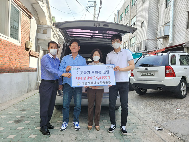 5월 14일 금요일 '강재원 팜스'에서 후원해주신 한돈불고기 350kg 중 중랑구청에 100박스(총 200kg)을 전달해드렸습니다. 같은 날 도움이 필요하신 소외계층에게도 2kg씩 전달해드렸습니다. ※모든행사는 코로나19 확산 예방을 위해 마스크 착용(사진 한장 찍을 때 외엔 필수로 착용하였습니다)과 손소독을 기본적으로 한 뒤 간략히 실행되었음을 알립니다. ![]()