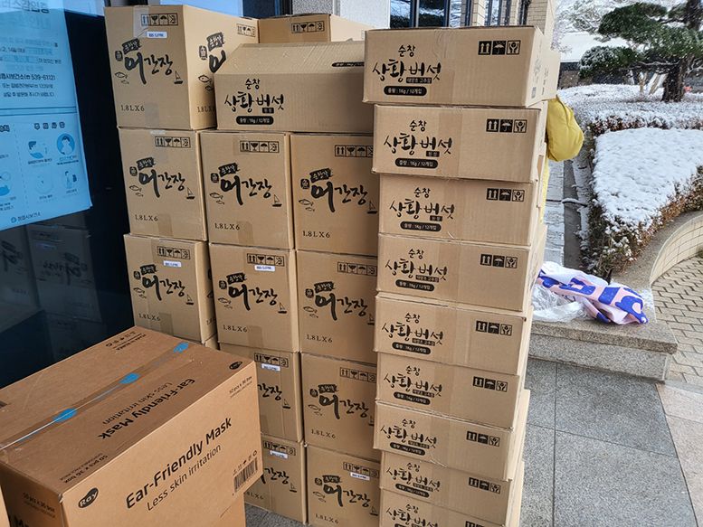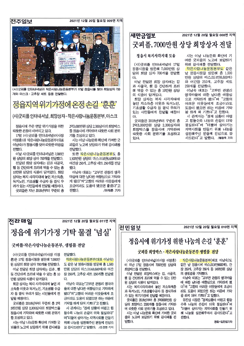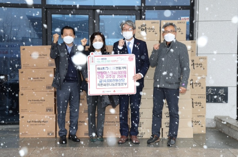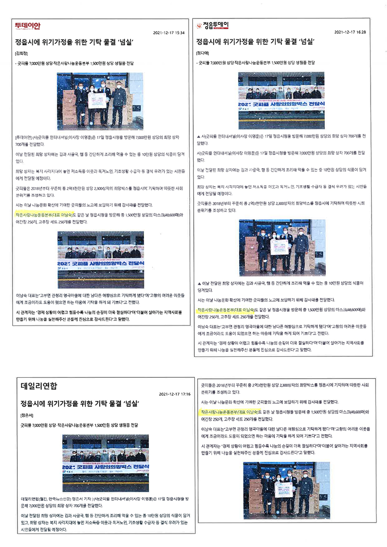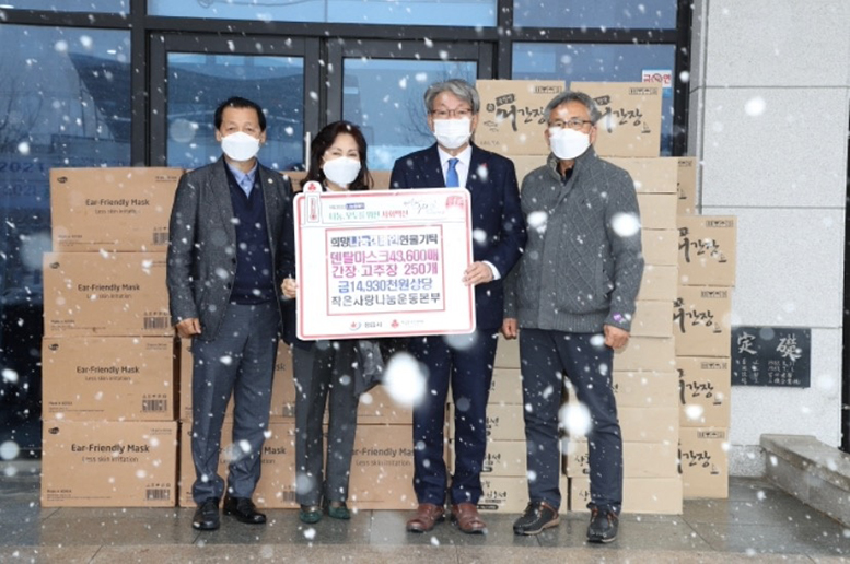 12월 17일 금요일 정읍시 위기가정을 위해 작은사랑나눔운동본부에서 상황버섯고추장(1kg)/ 어간장(1.8L)/ 덴탈마스크 각각 250개/250개/50,400개 총 1,500만원 상담의 물품들을 전달하였습니다. ※코로나19 확산을 방지하기 위해 모두 마스크 착용을 필수시 하여 간단한 전달식 후 바로 해산되었음을 알립니다. ![]() ![]() ![]() ![]() <관련 기사> ![]() ![]() ![]() |