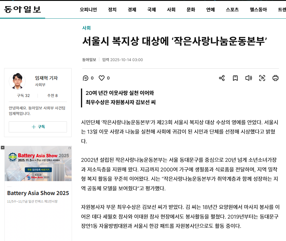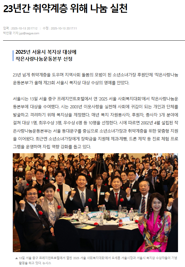 2025년 10월 13일 월요일 서울 프레지던트호텔 31층 슈벤트홀에서 진행된 제23회 서울시 복지상 수상식에서 작은사랑나눔운동본부가 대상을 수상하였습니다. 단체의 대표 이남숙 님께선 “작은 관심과 사랑만 있어도 누군가에게큰 힘이 될 수 있습니다.” “우리의 작은 노력이 아이들과 시민들에게희망과 행복으로 전해지길 바랍니다.” 라며 수상 소감을 남기셨습니다. |