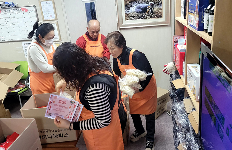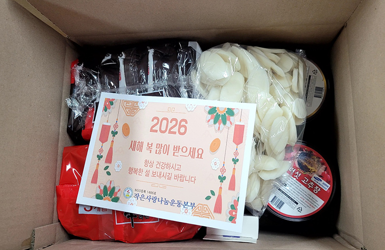 2026년 02월 03일 작업기간 : 2026.02.02 전달기간 : 2026.02.03 저소득층 가정을 위해 식용품들을 담은 '해피나눔박스'를 동대문구 각 14개동으로 총 200박스와 전라북도에 100박스, 총 300박스를 전달하였습니다. 물품 포장을 도와주신 봉사간원 분들과 나눔을 위해 도움을 주신 회원님들의 사랑에 진심으로 감사드립니다. 물품목록: 된장, 고추장, 라면(5개입)2봉지, 어간장, 떡국떡(1kg)1봉지, 보조배터리 *도움을 주신 회원님 명단* ※PC기준 ctrl+f 를 누르신 후 성함을 작성하시면 찾으실 수 있습니다! 도기주/탁진순/서준형/김경향/김호진/현혜경/허한나/김윤정/김한순/강신일/정연숙/연세화이트치과/박순주/최헌/박득진/박광진/문정희/류재철/도기동/SNJ/조순애/곽현욱/이하규/채구만/추학진/유원종/강종원/김명훈/정진석/강종필/(주)정림산업/장한일/조종형/한둘남/양전자시스템/장정석/구정본/오준호/안옥숙/이선정/이현석/김경순/정진호/전영호/권아연/임경표/지화용/엄성용/투게더헤어/문선국/강창용/차규정/천미란/홍준기/박춘원/박준상/박기철/김도희/이동아/이도완/최기홍/백귀현/정선용/이신우/이승희/권잠숙/지승희/송재봉/전형욱/안창현/홍성훈/이춘우/신승주/이종현/황순성/황재목/설대만/김상호/김은희/권성균/양승만/최재득/함영오/노규연/김윤기/최민지/김용진/이재우/최경희/김용수/김희종/김홍수/김학근/홍성근/정재호/정은미/김영태/김영숙/김연석/김순이/김수진/김소희/김연미/신진봉/박은순/한지명/김두환/이대범/김창수/김강수/조영미/소봉윤/장동효/신상철/안무엽/송미량/서양수/배진홍/최상수/최종대/김장수/김태범/이동용/배성관/이용숙/최원용/이미라/이기영/이금숙/허선옥/최지영/최연숙/윤덕수/윤석민/유주현/유은아/우국진/오제윤/오봉균/정진호/허두현/정희성/이동수/장석제/김준일/박우성/조상희/이성룡/조화준/이익재/조경군/김미화/김문실/정석도/장동환/정성진/정길구/권내현/최수경/이경수/이병철/이찬우/박숙자/오정환/김종환/이상훈/이정환/이원희/이상오/김선화/김선애/서정국/방동원/김상덕/차유성/김명호/주경희/이혜욱/이현준/이종환/박종현/박성호/롯데리아개봉점/김종현/김창중/노성룡(노우재)/김현호/채경수/김성찬/김이경/김해인/김희중/심오섭/임성현/김항진/남윤백/박상희/이영호/김동훈