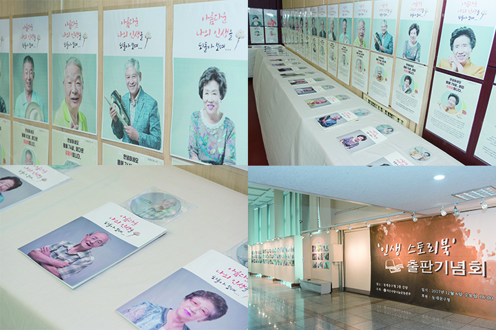 12월 6일 동대문구청 2층 다목적강당에서 '인생스토리북' 출판기념회가 열렸습니다. 저희 작은사랑나눔 운동본부가 지난 6월부터 동대문구에서 거주하시는 71분들의 인생을 담은 스토리북을 전달해드렸습니다. 스토리북 이 외에 경로당에서 즐겁게 생활하시고 어르신들이 살아온 이야기를 솔직하게 담은 영상들과 인터뷰, 하고 싶은 말씀들을 모아서 한편으로 만들어 드린 CD와 어르신들이 6개월 동안 활동하시고 경로당에서 웃으시고 스튜디오에서 찍은 이미지 사진들은 모두 하나의 USB에 담아서 스토리북 9권, CD 9장, USB 1개를 정성스럽게 포장하여서 어르신들께 전달해드리고 맛있는 뷔페 식사와 재미난 공연을 보여드렸습니다. 이렇게 뜻깊은 날에 참석해주시고 후원해주신 여러분들께 진심으로 감사드립니다. 모두 모두 추운 날 수고하셨습니다. 날이 많이 차갑습니다. 모두들 감기 조심하시고 행복한 한 해를 마무리하셨으면 좋겠습니다.
