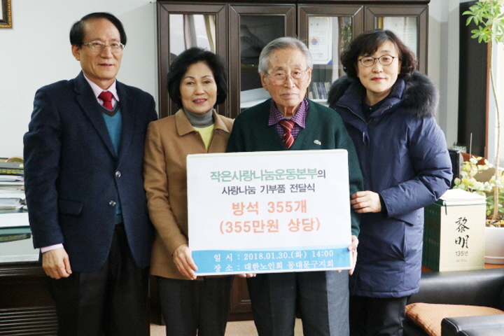 1월 30일에 작은사랑나눔운동본부는 대한노인회 동대문지회로 어르신들이 편하고 따듯하게 앉으실 수 있도록 방석 265개와 카시트 90개. 총 355개를 전달했습니다. |